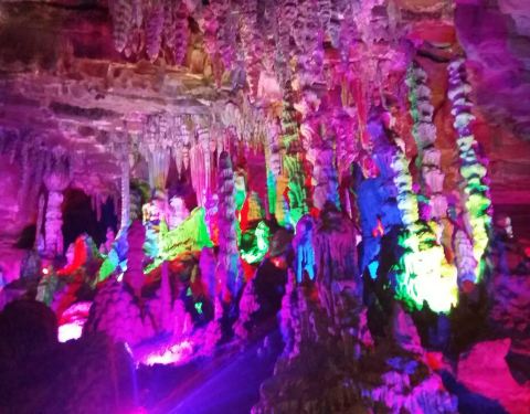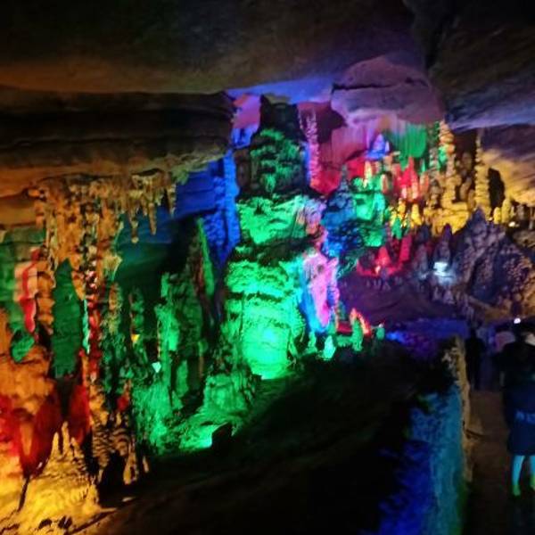 出了洞口,还要走几百米栈道,非常漂亮。三月中旬去过,在观景灯的呼应下非常漂亮三月中旬去过,在观景灯的呼应下非常漂亮。后来人给这里编写了很多现代神话,什么飞瀑,罗马柱,如椽大笔,动物世界,瓜果菜蔬,几乎每一处都有故事。听着导游讲,仿佛自己也进入了这故事中~~ 在我们走过洞中的幽...三月中旬去过,在观景灯的呼应下非常漂亮。后来人给这里编写了很多现代神话,什么飞瀑,罗马柱,如椽大笔,动物世界,瓜果菜蔬,几乎每一处都有故事。听着导游讲,仿佛自己也进入了这故事中~~ 在我们走过洞中的幽境后,来到了一片水域,居然在山腹中还有一条河,真算得上是意外的惊喜。这里水还比较清澈,能看到水底的岩石,我们坐着小舟体验了一把洞中泛舟的快感。出了洞口,还要走几百米栈道,非常漂亮。很值得去的地方,我的几个好姐妹清明小长假也准备去玩。 展开