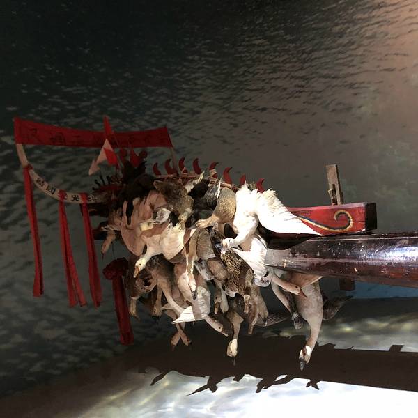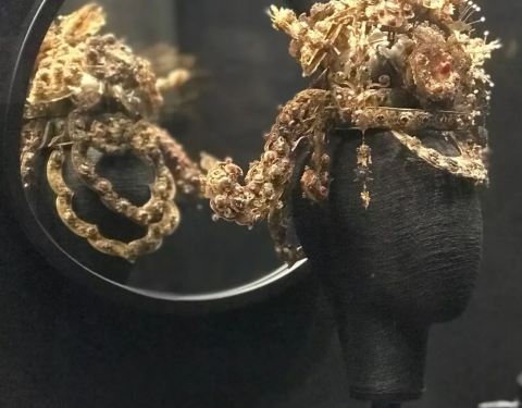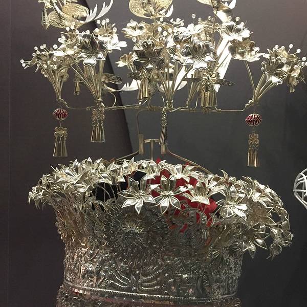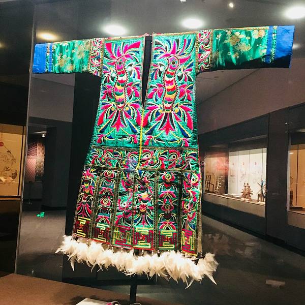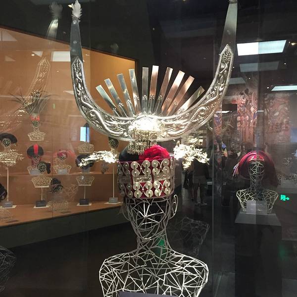 还有姊妹饭节,十里八乡的苗家姑娘把最贵重的首饰都穿在身上,小伙子们一起来对歌相亲讨五色饭吃,实在是相当淳朴直白毫不扭捏啊,要看颜看颜,要看财看财,要歌技有歌技,要手艺有手艺。从古到今,单身狗们为了相亲都还是蛮拼的!来不及去苗寨的同学,可以将就体验一下。这条龙舟全长17米,是整个省博第一件搬运进来的文物,因为是整木,得在大门修好之前就放进来。顺带说一嘴,这边的龙舟节是农历五月二十四到二十七,并不是为了纪念屈原哟,人家有人家自己的民族英雄啦,一位很牛的屠龙勇士!二楼是民族服饰展出,这是我最喜欢的一个厅,眼冒金光的就冲进去了,毕竟这是沉(chao)甸(ji)甸(gui)的民族文化精粹在发出璀(you)璨(qian)的光。总的来说,这边关于服饰的思路是这样的——第一当然是世代累积的财力展示,第二据说是为了财物的保管,东西都穿在身上,万一土匪来了可以一并带着跑,第三是当作盔甲用(大雾),那么软的银穿那么重在身上,讲解员小姐姐你确定不是在瞎扯吗?!非常独特的刺绣和艳丽的配色这个领子是不是很像白雪公主的小翻领东方蓬蓬裙,跟国外用裙撑不同,用20层裙子拗出来的造型,货真价实。勇士的帽子,毛越多越威,可参考孔雀和锦鸡。最令人眼花缭乱的当然是这些银质头饰了,每一件都精美繁复,若是能收藏一件也是极好的。不过若是全套盛装上身,要2.30斤咧。这个重量不是没练过的姑娘能承受的,吾等弱鸡还是算了。继续往上,就是古生物王国了,不赘述了,真正感兴趣的同学千万不要错过之前提到的4D电影,看那个更加生动详实。