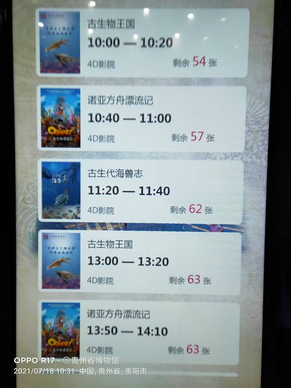 凭良心讲,贵州省博物馆的设计和设施都还蛮现代的,用身份证可以直接刷票,没带的话需要人工登记。据说快要可以微信预约参观了,但3线人民工作的速度总是谜之缓慢……取票点就在这里。经过前台的时候拿一份指南,大体了解馆内构造,也满足了我作为搜集癖的小爱好。特别推荐:进馆第一件事,去拿4D电影的票!不要钱!不要钱!不要钱!刷一个身份证可以拿3张,因为比较紧俏,所以参观之前先搞定可以节省时间。特别推荐古生物王国篇,3D特效虽然略渣,但知识点够丰富,4D效果很棒,毕竟是新设备。带小盆友的家长一!定!要!拿!
