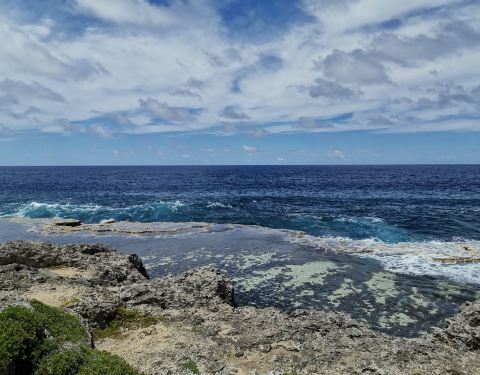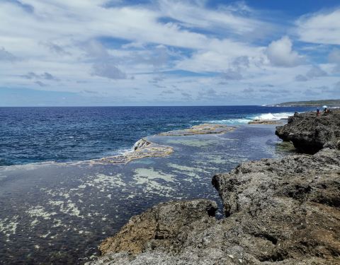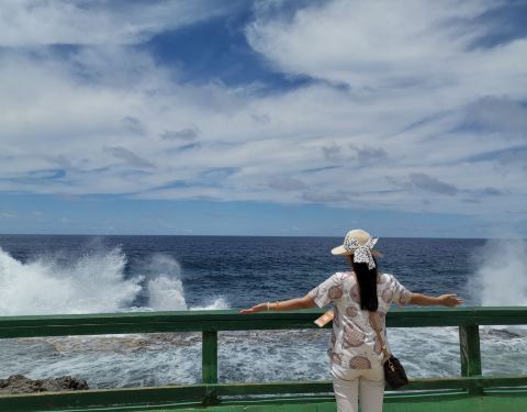 汤加还有南太平洋最壮观的喷水洞。在海边有个观景台,绵延数公里的海岸岩石在海浪的拍打下激起白色的浪花,从岩石的缝隙喷出的水柱,时大时小,有着大海自己的节奏。这时应有个交响曲才有应景的感觉。