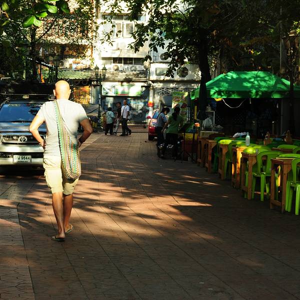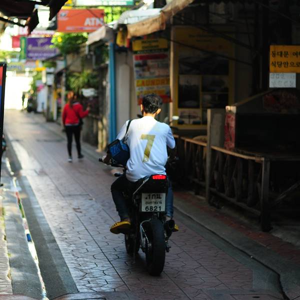 早上想去拍拍照片,老妈正好也在楼下,就一起去逛了逛。酒店后面的一条小路,一直走出去就是考山路。预订了前面右边那辆粉色的的出租车明天去汽车东站,说好300铢。结果他第二天居然没去!这次去泰国简直就是给小...