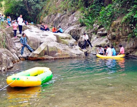 ...就是玩漂流,从山上漂下来,有些地方水还挺深的,整个船倒转过来,把人盖在底下,很刺激,不错的体验