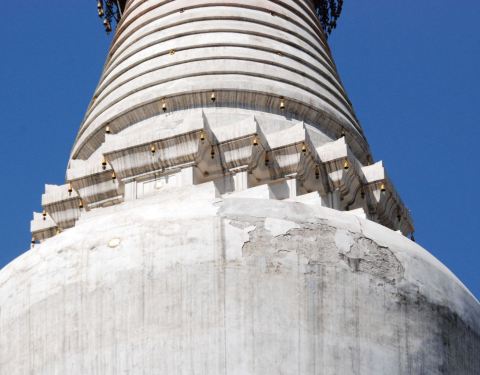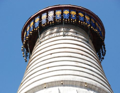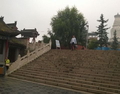 登上显通寺钟楼,可近距离观看对面的白塔,五台山的标志和象征。白塔全名为释迦文佛真身舍利塔,建于元代1302年,塔高75.3米,内外实心。塔尖有罗盘装饰,上面的铃铛起驱鸟防筑巢作用。