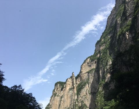 为了看到天台山泉瀑峡的云台天瀑,从潭瀑峡出来后直接走了三公里小路,后半程风景不错,爬过一个小山...为了看到天台山泉瀑峡的云台天瀑,从潭瀑峡出来后直接走了三公里小路,后半程风景不错,爬过一个小山后,见到了高达300多米巨大的崖壁,上面有一银链般的瀑布飞落下来,运气真好。