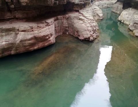 位于红石峡景区出口处,首龙瀑布下方,是一处面积不大但水位很深的水潭,这里是整个景区的水源地,三面都是暗红色的岩壁,靠瀑布与地下河补充来水。