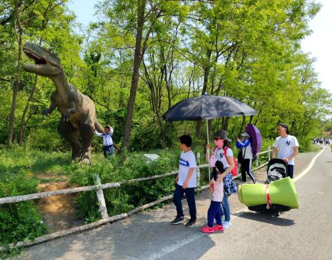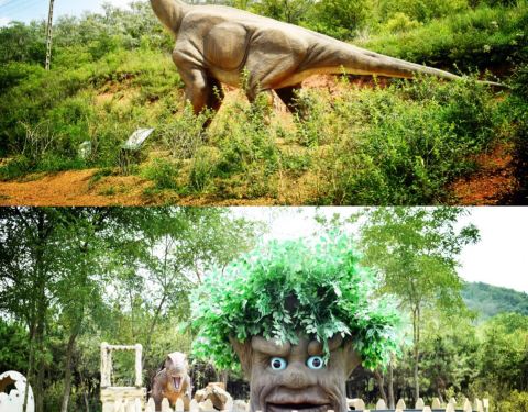⭐ 继续游览就会看到恐龙森林,恐龙们有隐藏在树丛中的,也有成群结队觅食玩耍的,造型和生效都做的很逼真,同行的小男孩喜欢的不得了🤗