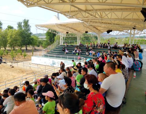 ⭐ 走过恐龙森林,可以去表演场看马术表演,期间还会找小朋友和家长上台互动,猜中大鹅赛跑冠军的游客可以得到骑马的代金券; 骑马的费用是60块钱一圈100块钱两圈,一圈大概7、8分钟吧,要去牛仔餐厅里面买票。