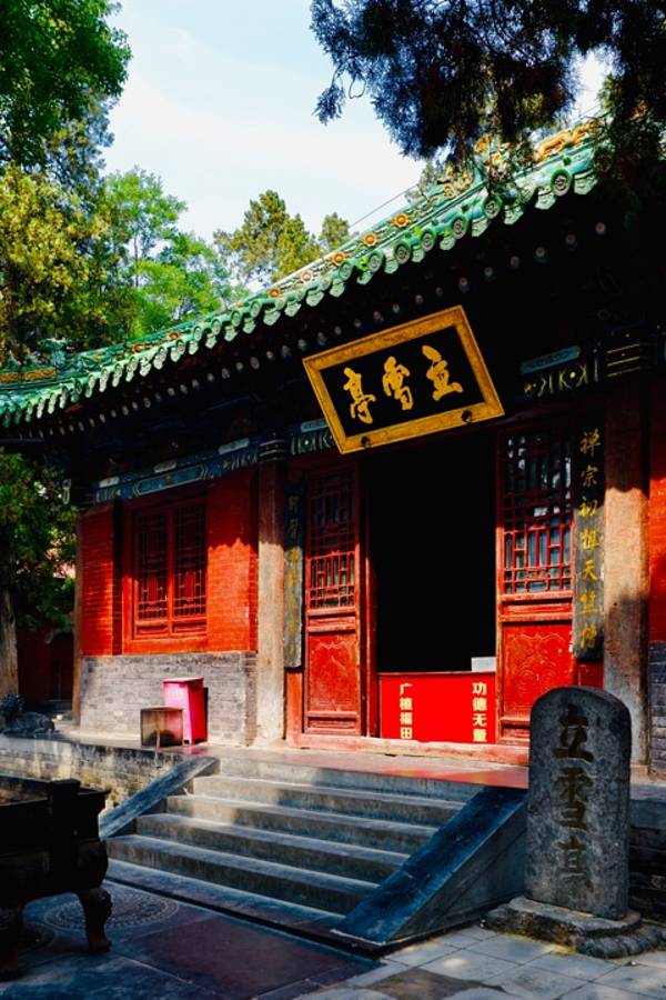 立雪亭,也叫达摩亭,始建于明朝,相传为二祖慧可立雪断臂向达摩祖师求法之处,现在为少林寺僧日常作佛事的场所。立雪亭位于方丈室后,殿内神龛中供奉达摩铜坐像,为明嘉靖十年(1531年)所铸。清乾隆皇帝瞻游中岳时,对“立雪断臂”的故事颇有感触,遂挥毫撰写“雪印心珠”匾一块,悬挂于立雪亭佛翕上方,以戒后生:佛业来之不易。