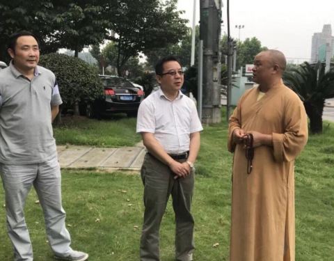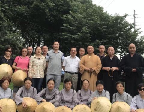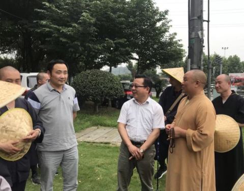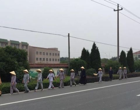 2018年5月30日,上海枫泾性觉寺行脚僧朝拜普陀山继续前行。天气:晴到多云,29度。 2018年5月30日,晨五时起香,天灰蒙蒙的,没有下雨,但是感觉异常闷热! 一大早行脚队僧众感觉疲惫不堪。经过六天的行程,路程已经超过了一半,所以尽管大家都汗流浃背,还是一如既往的踏步向前! 上午行走在s319省道上,路上车流繁忙,行脚队伍排成一条线向前走去!十时许,前方道路扩宽施工,车道变成半幅双向通行,为了安全起见,性觉寺妙悟法师带领行脚团队走在没有车流的施工路面上,上面都是碎石,行走的异常艰难!久道法师因为是第一次行脚,脚上前几日磨出的水泡还没完全好,又磨起了许多水泡,每一次踩在尖利的石子上都是一种刺心的痛,脚步慢慢就缓了下来!性觉寺妙悟法师见状为了不让每一个行脚人员掉队就带领行脚团队慢慢停下脚步,等候其赶上来,然后适当放慢了脚步继续向前!