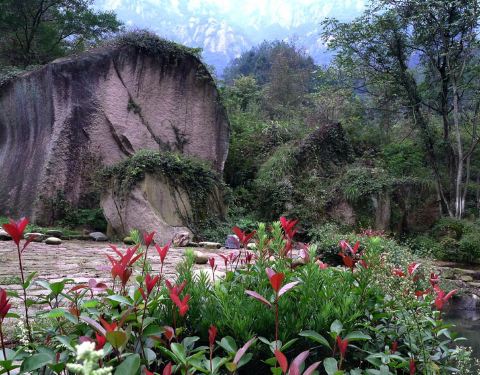 莲峰云海位于池州市青阳县南边,距县城约7、8公里,属于九华山脉的后山,主峰莲花峰是九华山脉九峰中的一座,为莲峰云海景区内的高峰,海拔1048米。不过莲峰云海与九华山风景区并不是同一个景区,莲峰云海在九华山的北边,两者的大门相距十几公里。相比九华山的盛名,莲峰云海还养在深闺中,非常清净,山上奇峰怪石众多,有瀑布可观,因常年云遮雾绕,所以叫“莲峰云海”。景区的山路呈“8”字型,从一边上山,另一边下山,不用走回头路。进景区大门后如果从右手边上山,先走一段沥青马路,马路尽头是一片巨石阵,秋天可在此赏石边树林的红叶。由此开始走台阶路,会经过藏经洞,弯腰躬身循着一条小道进洞,洞内有石桌石椅,南宋诗僧希坦曾在此禅修。再爬几分钟,就到了当地人信奉的干老石,据说在石头下烧些纸祈求疾病的治愈很灵验。继续向上攀爬,能听到溪水和瀑布声,先是看到一个个小瀑布,后看到高大的一挂瀑布便是狮子口瀑布。一般游客到达狮子口瀑布后即下山,往下走到一个平台,在边上的望阳亭可俯看山下的田园风光,回望山顶,有各种造型奇特的石头,险的是“达摩面壁”,还有的像猴子观涛,有的像东海神龟。到山脚后,你可以去徽派民居模样的民俗博物馆内,参观文革时的照片、海报,根雕,青阳农民画,了解青阳县的历史和农耕器具。另外,山上还有建于明成化十八年(公元1480年)全部用石头砌成的净信古寺,有一尊8米多长精美玉卧佛的圆通寺等寺庙可拜访。这样走一圈景区,玩得快的话约需2.5小时。狮子口瀑布位于景区“8”字型山路两个圆圈的交点上,是走山路的一个标志。瀑布往上还有道路通向山顶,一般游客只玩“8”字下面的那个圆圈,上面的那个圆圈非常大,算上到了山顶还要下山的时间,需要整整一天,山顶又没有住宿的地方,一般只有驴友、背包客才会继续往上爬。看日出的话,在狮子口瀑布那已能看到,当然越往山顶走效果越好,还能见到云海。景区内有四星级酒店莲峰云海酒店,位于山脚,前面有个大池子龙潭。如果追求日出或者想要爬到山上更高的地方,你可以晚上过来入住酒店,天不亮就登山,到尽量高的地方看日出,然后尝试登顶,量力而行,需掌握好时间下山。