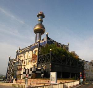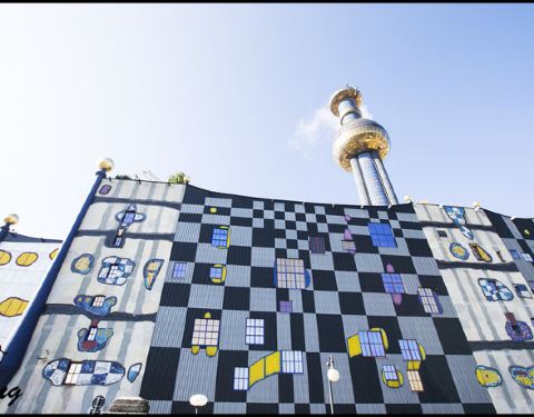 1992年维也纳市内建起了这座环保的垃圾焚烧厂, 维也纳人有意避开“垃圾”这个字眼,按功能命名它为维也纳远程供热厂。百水先生主动请缨,免费为这座建筑设计外墙装饰,使这个处理垃圾的场地变成了这个童 话世界,也成为维也纳一个比较重要的地标。 百水建筑有一个共同的特点就是窗户的外型都是不一样、不规则的。因为他相信,只有这种不同款式、不同色彩的设计,才能让窗户在建筑中“跳起舞来”,才能营造出有生命力的建筑。
