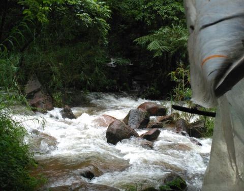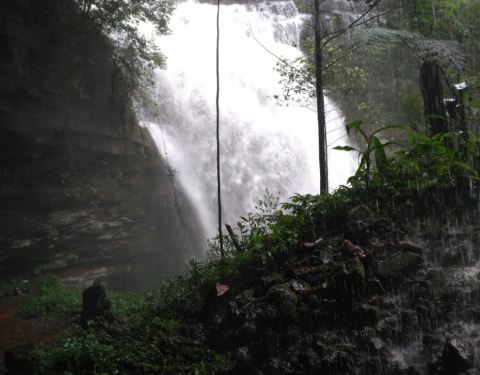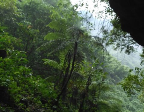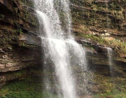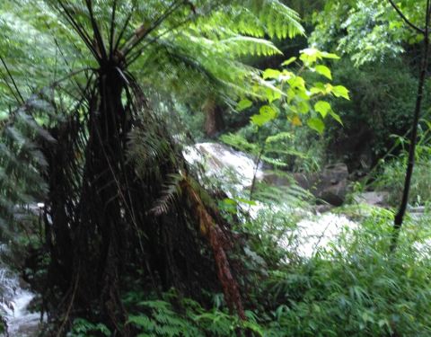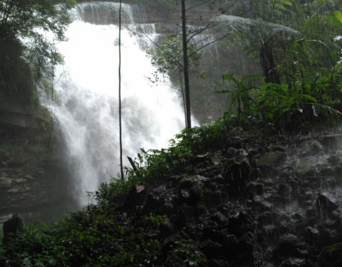 直到路穷之时,但见一瀑布从悬崖上方飞泻而下,震耳欲聋。右方小溪旁,灌木丛生,有棵树树干结果,甚是奇观