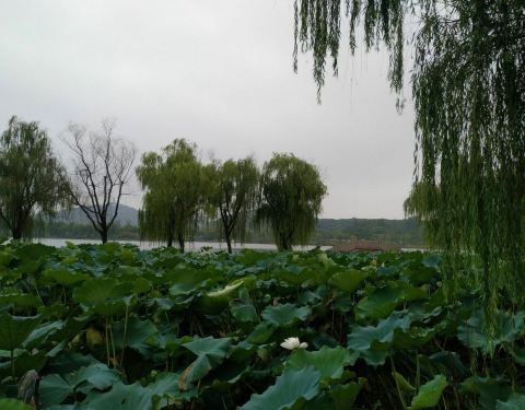 北山街进入白堤路口的亭子的,这里可以看到西湖边上种满荷花的,这亭子也是经济人山人海的,夏天赏荷冬天有下雪的话赏断桥残雪是一级美景的
