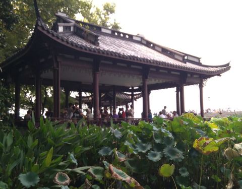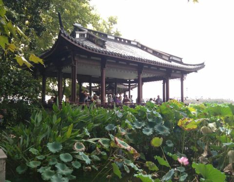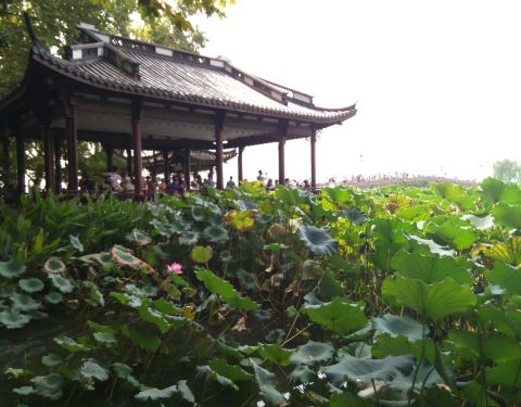 黛瓦朱栏,是湖畔著名水榭之一;白堤的始点,葛岭的入口,在此可远眺外湖漾漾水色,近赏里湖连天荷叶