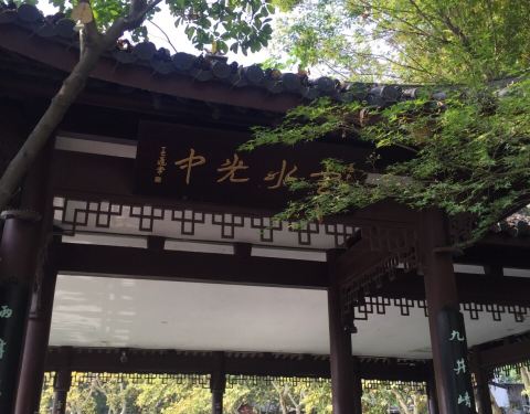 “云水光中”水榭临湖而筑,位于断桥侧畔;黛瓦朱栏,是湖畔著名水榭之一;白堤的始点,葛岭的入口,在此可远眺外湖漾漾水色,近赏里湖连天荷叶。