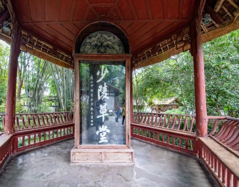 少陵碑亭位于杜甫草堂内,就在工部祠边上。因为杜甫经常自称杜少陵,因此杜甫草堂其实也可以称为少陵草堂,而此碑就是为了纪念杜甫草堂而立。所以,来看看这个碑还是很有意义的,来到杜甫草堂不要错过。