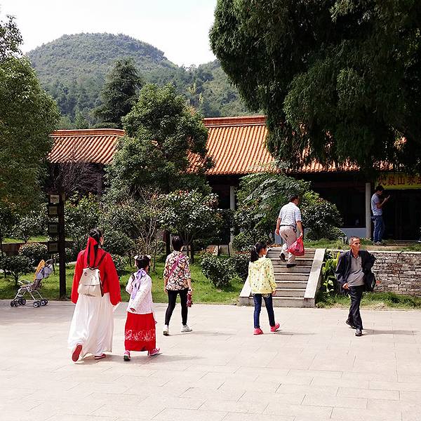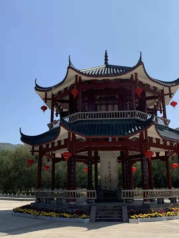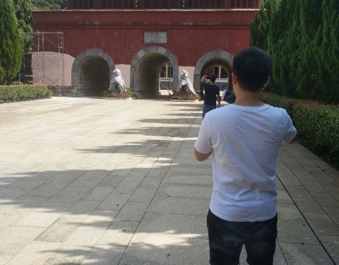 九月十日中午一点多钟,我们五个人从三分石景区出来,在路旁的盘龙瑶寨吃了午饭,稍作休息,因有两位同事从没到过舜帝陵,所以我们陪他们回到舜帝陵景区,重游舜帝陵。舜帝陵是传说中的中华始祖之一舜帝的陵墓,这里有着厚重的历史文化底蕴,被称为“中华第一陵”。 今年四月三十一日我来过一次,当时湖南经视正在这里准备直播一个滑翔飞行节目,可是由于风向不对,没能按时进行,直到下午三点我们回到家,刚好在电视看到了正在进行的直播。 那天正值五一期间,景区门口的大广场周围彩旗猎猎,游人众多,十分热闹。记得当时我们没买九嶷山风景区的套票,只买了舜帝陵的门票,八十元一张。 今天是教师节,我们只要拿出教师资格证就可以进去。此时已是下午三点多,太阳当空照,游人稀少。里面一条大道,称为神道,处在陵区中轴线上,中轴线上有午门、拜殿、正殿、寝殿,两边有各种配殿和碑廊。此时拜殿和正殿都正在维修,都被遮盖起来,所以整个陵区景色没上次来那么好看。我们只好仔仔细细地参观旁边的钟楼、鼓楼、中华姓氏文化馆,有两个同事还跑去品茶,精挑细选了舜帝玉佩,说是今天最大的收获是请了一尊舜帝回家。 如果说看自然景物,这里自然比不上三分石,但这里的人文景观更胜一筹。幸亏我上次来跟着一位别的游客请的导游,听她讲解,否则我也会如一般游客那样觉得这里没什么看头。看这里就是一个不大的四方形院落,其实这里的文物众多,那些石碑都是来历不凡,这里的古树也是宝啊,还有每一株斑竹都在诉说着娥皇和女英的故事。走马观花般游览这里,一个小时绰绰有余,而我们花了将近两小时。然后急急奔向九嶷山风景区的另一个景点玉琯岩……