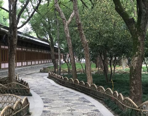 为了走翁家山到南高峰的步道,在四月下旬专门去了趟杭州,从南高峰下来见到六通宾馆,就是云台山路。由于天色已近黄昏,我和夫人匆匆把背包放在三台云舍民宿区中的涵轩旅馆,出门穿过三台山马路就看到路边耸一巨石,上书三台遗迹朱红大字。沿小径寻迹而进,就见有几座殿舍,其中一较大屋宇有一横扁,上书湖畔大学,恍然大悟此处圣地原来就是马云在杭州创建的研讨型大学所在区域。再进入景区,两旁竹编矮篱笆引你曲径通幽,直达一拱桥所连长廊,逶迤曲折把你带到对岸。这条长廊在夕阳照射下倒影迷人,久久不愿离去。湖与西湖相通,湖面较大,湖对面的雪舫和武状元牌楼点缀于绿色之中煞是养眼,沿湖左转能到祈福殿,穿过长廊就能到龙井路,朝前走几步就是杨公堤,西湖国宾馆,郭庄,杭州花铺就在沿线,走到岳庙也就半个小时。由于天色渐暗,在三台遗迹转了近一小时从湖畔大学的巨石边出来回旅馆休息,第二天一早又去观赏了一圈,特记,共享。
