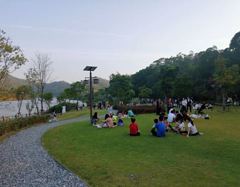 这里的“玩法”全凭心意:可以沿着3.2公里的环湖步道快走,看光影在水面流动;可以找块被阳光晒暖的草坪躺下,看云朵飘过山头;也可以像本地老人那样,带个保温杯坐在树荫下,对着水面发一下午呆。我曾遇见一位阿婆,提着竹篮在岸边采野菜,她说:“年轻时来这挑过水,现在带孙子来玩,水库还是老样子,真好。”