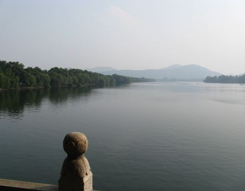 此地景色极佳,可望苏堤及香格里拉饭店及原西泠饭店,亦可望"曲院风荷内的玉带桥位于金沙堤上,因状似玉带而名,系清雍正年间浙督李卫所建.此地景色极佳,可望苏堤及香格里拉饭店及原西泠饭店,亦可望"四面青山皆入画,诗在烟光柳色间."的苏堤,还可望湖中的阮公墩.