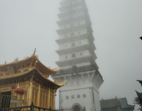楞严塔在鸡足山顶,塔高13层,山顶不大,显得塔身非常高大,特别是清早总是云雾缭绕时隐时现。去的时候雾大没有看见是否能登顶。整个山顶有一半在修建,时隐时现能看见一些周围的山头,感觉太早上去还是不好,现在又是雨季山顶大雾是常态,下到半山云开雾散,直后悔下山的太快。