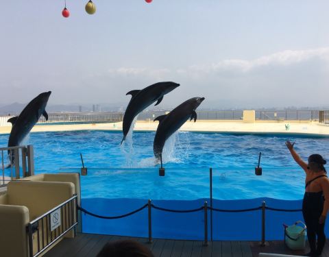 一下船,港口旁边就是海洋世界。海洋世界是需要买门票的,个人买票的话,成人2300日元一个人,4岁以下小朋友免费,4岁以上又分小学生中学生高校生,门票分别1000日元到2300日元不等。海洋世界虽然不大,但非常有趣和精致,强烈推荐!里面有海豚表演,表演场临近海边,从看台上望去水天一色,视野非常广阔。