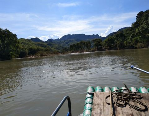 这里坐的是竹筏,风景很美,有几个景点:青蛙跳,将军石,乌龟石……