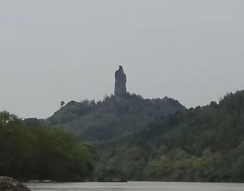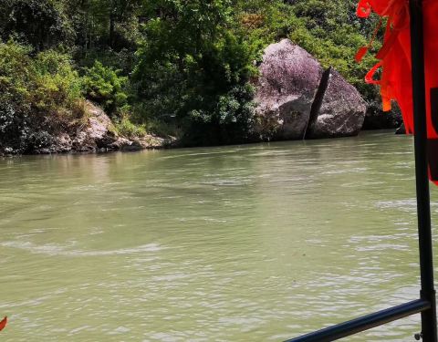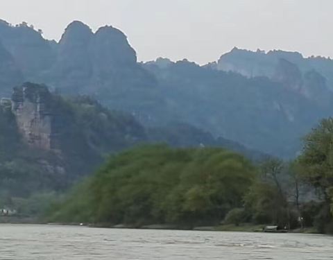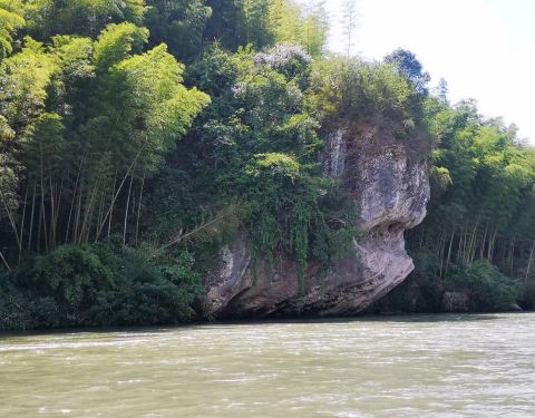很优美、宁静,观赏江边的将军石(1座小山峰)、竹筏码头,有小孩摘了些红色的野果用树叶包着出售,...