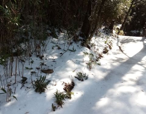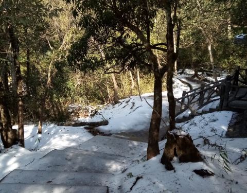 从天台山坐车过去约二三十分钟车程,停车场处有个森林宾馆,可以在这午餐或住宿。从停车场走左边的那个到将军石约4公里,要走约1小时,因为前几天大雪,前面的路封了,只能原路返回。这段路风景一般,不过因为有积雪,可以边走边打雪仗。
