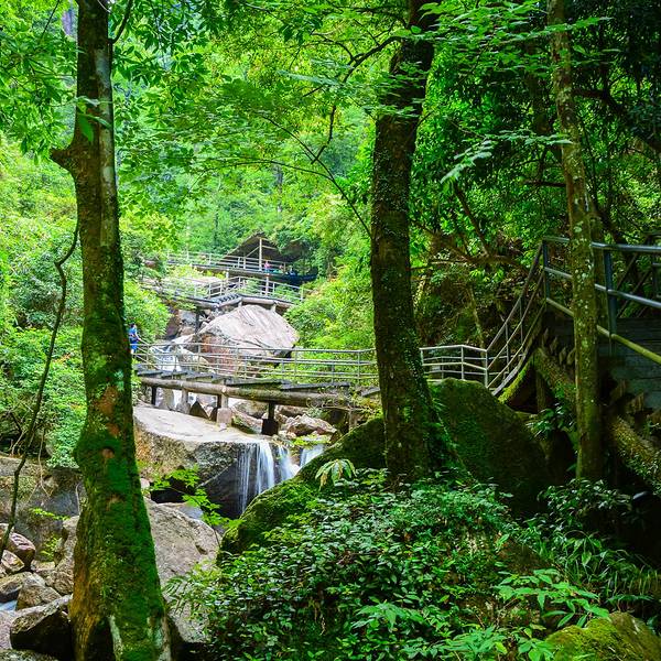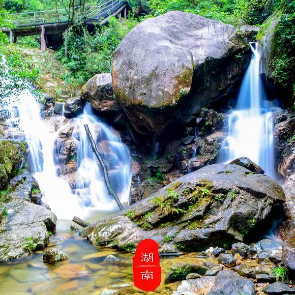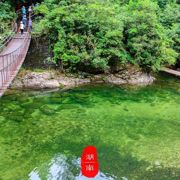索桥之下,尽是如翡翠般碧绿的池水,让人看着心旷神怡。沿着栈道一路向上,满眼山清水秀、水色天光,湍急的水流泄下,成为一道道如纱般的瀑布。密林遮天 山水相间 流水潺潺 在这湘南的密林之中 尽情感受负氧离子...