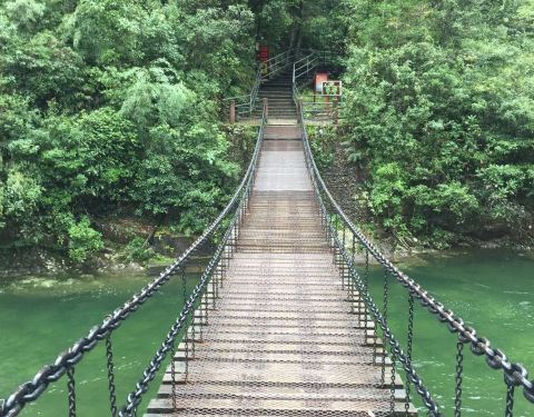 尽情感受负氧离子...索桥之下,尽是如翡翠般碧绿的池水,让人看着心旷神怡。沿着栈道一路向上,满眼山清水秀、水色天光,湍急的水流泄下,成为一道道如纱般的瀑布。密林遮天