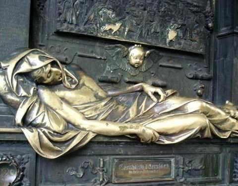 这个创作于19世纪的雕像作品的主角是比利时著名的14世纪的英雄人物,表现的应该是他临死时候的状...