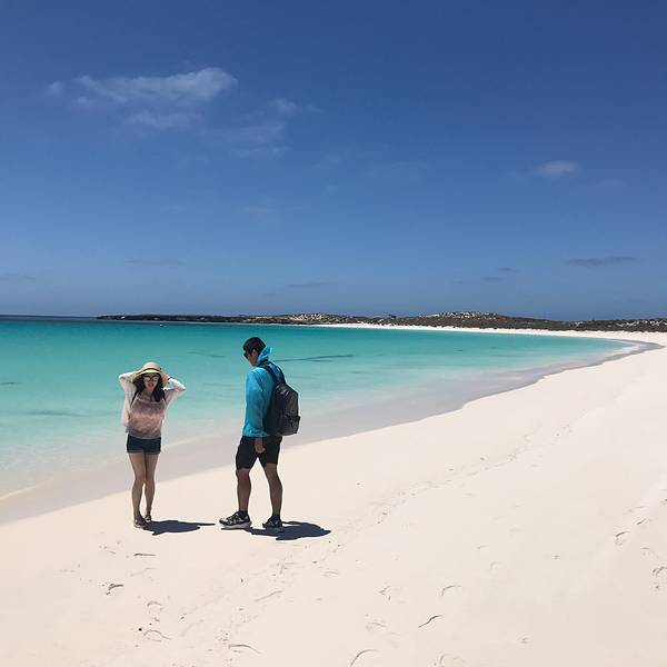九点半起飞,不到九点准时到达机场。有一个台湾美女是接待,沟通无障碍,然后发现飞行员是一个大帅哥,瞬间心花怒放,可惜没有拍下来,算了已经被我记在心里了, 哈哈这是我们的飞机,算上飞行员可以坐7个人。 上飞机前美女给我们介绍了一下游览路线及阿布罗斯群岛的一些故事,大多都是惨烈的沉船事件。阿布洛霍斯群岛被称为“西澳最后的秘境”,因神秘、壮观与纯净而著称。每年只有渔民及家人还有一定量的游客进出岛屿,因此这片海域纯洁如初,完全未受污染,游客不被允许住宿在岛上过夜。 阿布洛霍斯群岛本身由珊瑚礁群落组成,因为珊瑚礁较浅并且没有遭到任何破坏,这里是世界上最适合浮潜的乐园之一,堪比大堡礁。因李文洋流的作用,水温常年保持在20-22度,任何时候都适合游泳和浮潜。准备起飞啦马上飞离杰拉尔顿遇到了一颗心形礁,好幸运,“西澳大堡礁”看来一点也不逊色于大堡礁啊,哈哈这里是一个沉船的触礁点右边有个四方形的堡垒,名字不记得,但是它富有故事,想知道就去看看去听听,我就不陈述了,好长的故事。我们在东华勒比岛着陆,这是一个无人岛,美得无与伦比,我的照片无法记录它的美,终于明白为什么说阿布洛霍斯群岛是“西澳最后的秘境”,名副其实。上了岛才发现,这个岛总共就我们一飞机的8个人。一边走一边后悔没有带付钱工具上岛,没有带无人机上岛,想哭。听飞行员说,中国很多饭店的澳洲龙虾都来自于阿布洛霍斯群岛,中国目前是阿布洛霍斯群岛龙虾最重要的市场。澳洲人本身不怎么吃龙虾,都是要出口的。看来挣钱比吃更重要哈。岛屿因得天独厚的地理环境,拥有丰富的动植物资源。有各种蜥蜴,白腹海雕、海鹰等等,你看这个大蜥蜴跑到了飞行员的浮潜工具箱里,好大一条。特别是珍稀动物华勒比小袋鼠(Wallaby,超小型袋鼠,只有岛上才有的特殊袋鼠物种)这是岛上的植被,都很矮。据说这是大陆板块分裂时分出的岛,那本身在岛上的大袋鼠由于植被低矮,进化成小袋鼠。有没有很厉害,从大变到小竟然也是一种进化。贝壳化石据说,每年12月1月最热的时候,小袋鼠热的受不了,会偷偷的跑到这里泡泡水,同时还要躲避老鹰的视线。我们是半天行程,所以不到十二点半的时候我们往回走啦送我们回去的飞行员是一位香港人,他说他就在这里上的大学,学的就是飞行员,毕业了就在这里工作,每天就是送客人来岛上,然后浮潜,玩耍,再送客人们回去。我们都觉得这个工作太爽了,每天都可以上岛看这样美的风景。这就飞回来了,用时半个小时。飞机虽然小,但是只要不急转就不会晕,在去的时候帅哥要给我们看堡垒,急转了好几次,在我快要吐的时候终于着陆了。