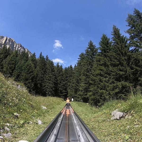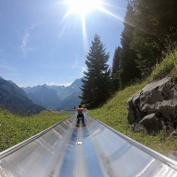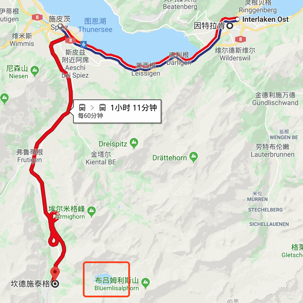 来厄希嫩湖主要是因为我想玩一个高山滑道,这个湖很少在瑞士的攻略中出现,是朋友的瑞士朋友推荐的,当地的人很喜欢去的一个地方。去了之后确实发现几乎没有中国人,很多瑞士本地人去那里hiking,野餐。但是个人感觉这个湖没有很好看,如果不玩儿水也不玩儿滑道的话确实没有必要特意来一趟。先给大家介绍一下来这里的路线吧。我们是从因特拉肯坐车到施皮茨,存了行李(怕kandersteg柜子太少没地方存,事实证明还是有的,我们相当于得多走一段回头路了),再坐车到kandersteg,然后坐缆车上山,再徒步大概四十分钟就到了。 厄希嫩湖官网:https://www.oeschinensee.ch/en/ 可以查看缆车班次和游玩儿信息。红色的框框就是厄希嫩高山湖,到kandersteg车站买票就可以了,我们直接买了缆车票+3次滑道,比在山上买便宜。这个缆车票是不包含在瑞士通票中的。从kandersteg车站出来走到上山的缆车站还要走十几分钟,但是一路风景非常好,像走在画里一样,主要也是因为天气特别好,大晴天。缆车上,因为人特别少,所以我们两个承包了一整个车厢。车厢也是全景的,四面都可以看风景。下了缆车就是期待已久的高山滑道了,瑞士很多山上都有这种滑道,一次只要5瑞郎(https://www.oeschinensee.ch/sommer/rodeln/滑道的官网,可以自己查价钱和开放时间),直接买五次票会有优惠,山下能买到优惠的三次票这里就没有卖了。这个真的值得玩儿一次,不恐怖,可以自己控制速度,想要刺激的就快一点,害怕的就慢点走就好了,但还是速度快一些更爽哈哈。但是这个滑道是不可以带手机录像的,Go Pro也必须绑在身上才能录,我们虽然没带绑带,上去之后就直接拿着go pro偷偷录了。牵引上升的时候往下滑,一路景色都超美,而且滑快了之后超爽。我俩一人玩儿了三遍,第一遍我还不太敢速度太快,之后就觉得越快越爽了。玩儿完滑道就开始徒步去高山湖了,大概要走四十分钟左右,说实话见到这个湖有点失望,因为感觉还没有路边碰到的湖蓝,但是有超多人在湖边野餐,玩儿水,划船,我们就随便拍了几张回去了。调了调颜色稍微蓝一点,本来还是偏灰一些。其实也还挺好看的哈,哈哈哈哈可能觉得不值得来回走一个多小时来看吧。