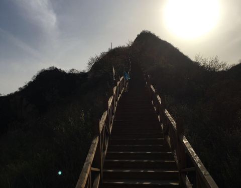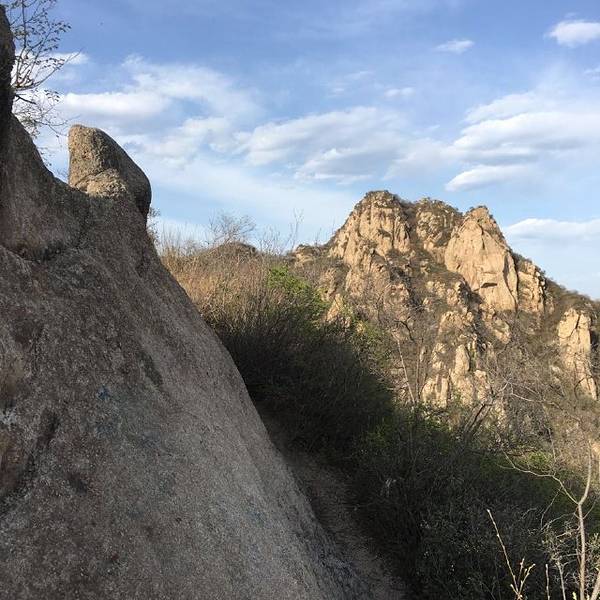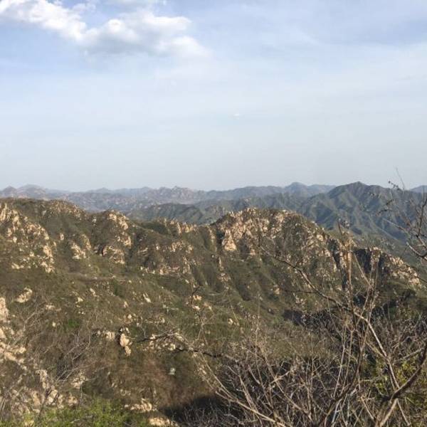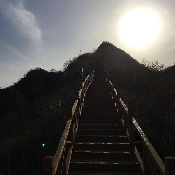 这山谷处在深山中,驱车前往路途中已感觉空气清新,沥青道路平坦甚至鲜见碎石,车胎的声音甚是悦耳。 进景区大门后各个景点颇为让人失望,都是一些石头被深拉硬拽的写上一些典故。走了好长一段木扶梯以后终于登顶了,终于感觉豁然开朗,不虚此行啊!背靠怪石嶙峋的一大片山峰,清风徐来,将衣服的汗渍拂干。可远眺十三陵,亦可近观绚丽花开。逗留拍照之后开始从左侧下山。左侧山峰正在开始铺设道路,路况可想而知,主要以沙石为主,很容易滑倒,真是一失足恐怕再也看不见日出日落了,因此要颇为小心,可借助木棍或者半蹲前行。全程6.5公里,还是一次比较特别的体验。待到9月猕猴桃成熟,草长莺飞,再相会
