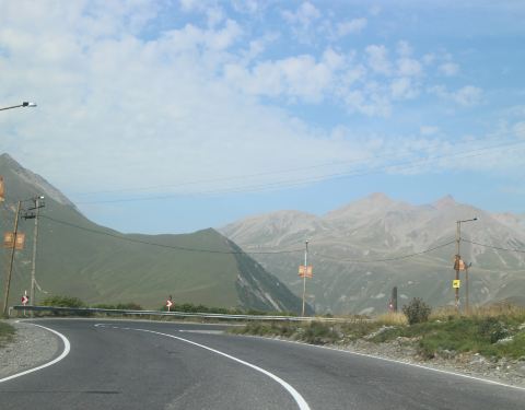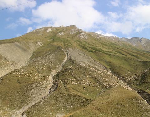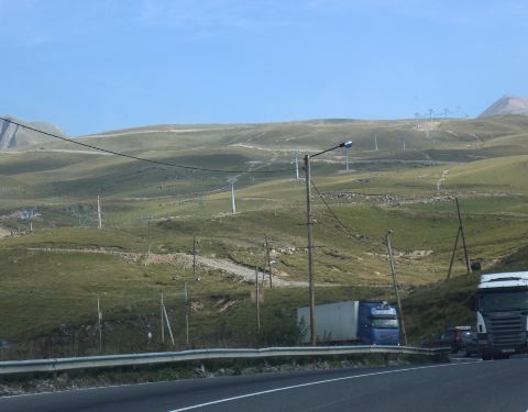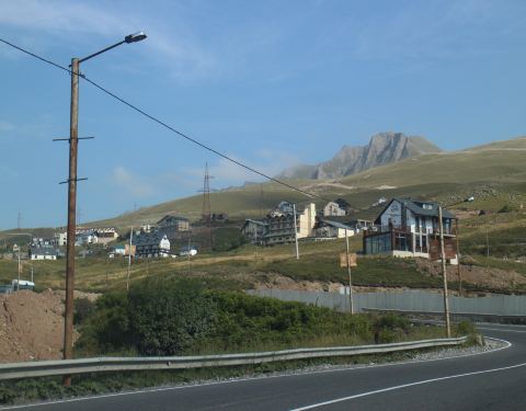 告别没有什么看头的阿纳怒日要塞,随后汽车一直行驶在路况很不错的山区公路上,尽管不停地盘山绕行,但眼中看到的风景却是非常优美。途中汽车经过一个有很多高档酒店宾馆的小镇,从路边的巨幅广告牌可以看出,这里是一个很吸引人的滑雪旅游度假胜地。地图上标注的这个地方叫“古道里”。随后汽车在风景更加迷人的山区盘山公路一路上行,这一带的山区生长的都是草本植物,因此更显出风吹草地见牛羊的景色。而公路两旁的山坡上也确实有不少的羊群牛群在放牧,偶尔还看见羊群排着整齐的列队横穿绿色的山坡,如此守纪律讲规矩的羊群我们也是第一次领教。