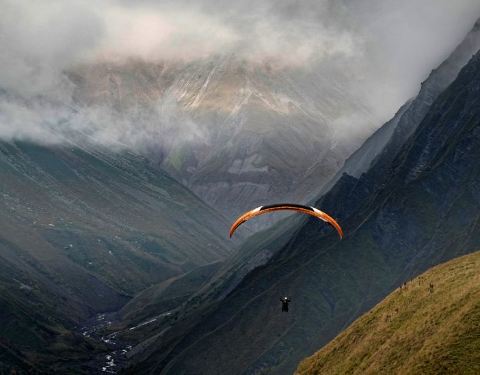 俄格纪念碑其实也是峡谷的观景台,就在俄罗斯和格鲁吉亚边境线上,不得不说,峡谷的风景实在是壮丽无比。纪念碑也很有特色,颠覆了以往一柱擎天的固有印象,是由巨石磊成环状的建筑,上面可有精美的壁画,色彩浓郁,一派歌舞升平的景象。在这广阔天地间的纪念碑,一如既往的闪耀着色彩,可是想到如今的两国关系,让人在美景中除了赞叹大自然的惊艳之外,那便会滋生出一些遗憾,两国经历了那么多的恩恩怨怨,格鲁吉亚人现在看到这个纪念碑应该会觉得很尴尬,但历史终究是历史,说不定若干年以后又和好如初了呢?放眼远眺,四周的风光真的是无以伦比,远处红色的山峰若隐若现,阳光穿透云层,心旷神怡,高加索之泪犹如镶嵌在群山之中的绿宝石,美不胜收,几架滑雪伞不约而至,激动人心。其实这里也是格鲁吉亚最为著名的雪乡,是欧洲人心目中的滑雪胜地。纪念碑下方有一条小径,可以近距离的接触,山峰前面无遮无挡,下面就是万丈深渊,真的是一览众山小的感觉。外高加索的风光的确让人不虚此行!