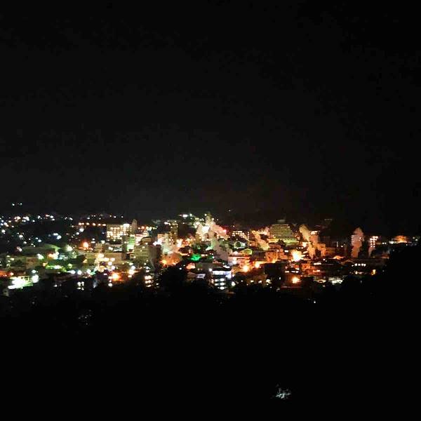 #2018.3 九州天空城之别府# 别府的夜晚静悄悄,在铁轮地狱附近吃完晚饭,无意间搜到温泉蒸汽展望台就在不到1公里,于是一路蜿蜒曲折的跟着导航爬上去。结果步行导航无论是谷歌还是百度,全部是错的。到了导航的目的地发现居然是居民区。好在遇到附近跑步回家的中年大叔,重新问清了地址,又一路走了4、5百米才终于顺利到达。 晚上的温泉蒸汽展望台,黑漆漆地就像个停车场,一不注意就会错过。 当看到夜景的那一刻,便觉得所有辛苦都是值得,温泉之上的尿尿蒸汽,白色的蒸汽再黑丝绒一样的夜幕中更明显。只是可惜相机在酒店没有带出来,手机完全拍不出实际的美景。不过如果是女孩子还是要注意安全。夜晚这个区域路灯较少,也很少有人在外走动,偶尔才有一辆汽车经过。