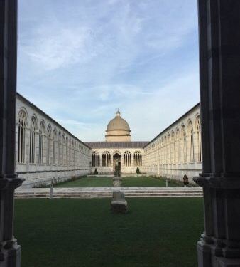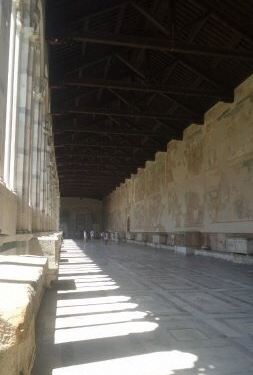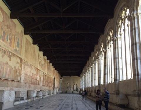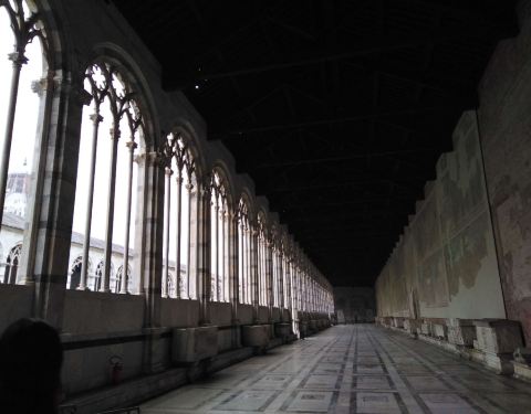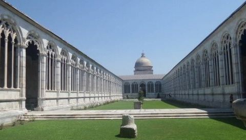 比萨墓园,位于比萨市中心奇迹广场,占地不大,罗马风格建筑,墓园内部中间是一片大草坪,两侧是罗马式回廊