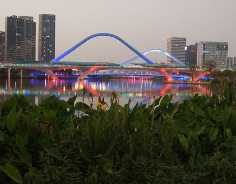 蕉门地铁出来走十几分钟就到了,地方不是很大就是一条河涌,白天人很少的,晚上就比较多人,很多人晚上吃完饭都是喜欢来这里逛一下,吹吹风,旁边就是万达广场了,那里有很多小吃,价格有点小贵,还有超市,和看电影的,这地方的话有点远了,坐地铁要坐一个多小时,本地人的话非常不错的一个地方,吃完晚饭还可以来这里坐坐散步逛一下。这里晚上七点钟以后,灯光开起来的话也蛮漂亮的,那个桥那里灯光很漂亮,我每次有时间都会来这里逛下,