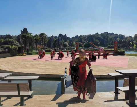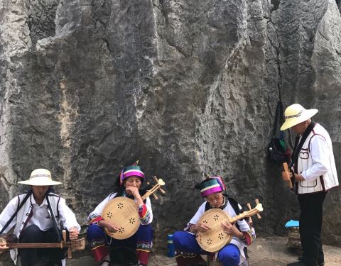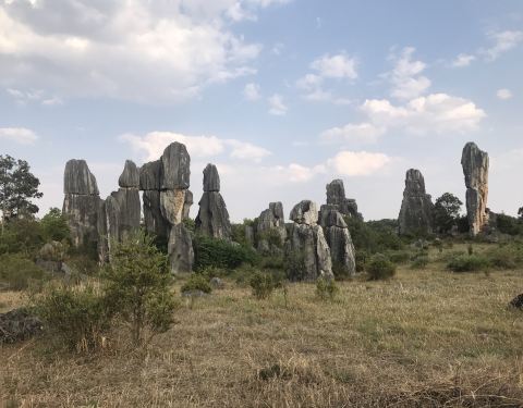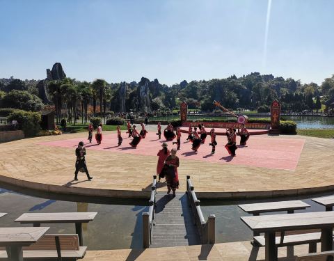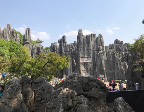 昆明长水机场搭巴士大概两个小时到石林,早六点半集合八点出发二十分钟到景点阿诗玛石像,石林是彝族自治州,云南代表大象孔雀,傣族,民族村三塔。东方女儿国,男不娶女不嫁。泸沽湖感受母系社会风情。云南一烟草二有色金属王国,三植物王国,四水力发电五旅游业,先大石林景区后小石林区,石林大巴九点二十到达需购电动车票到一个地址博物馆未来以来石雕那边出发到大石林售票处买石林入门全票进入,十一点半门口集合。游玩了半天很多美景拍照,中午去干饭(彝族方言)大石林区有心脏石叫狼心狗肺石要摸摸,还有猫石还有良心石,还有一线天,小石林区有阿马诗的石雕。美中不足万年灵芝园没有去,下次自由行可以游玩一天都可以。