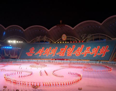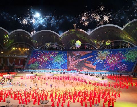 观看朝鲜的改革以及历史进程。偌大的体育场座无虚席,外国游客都是被安排在很好的位置