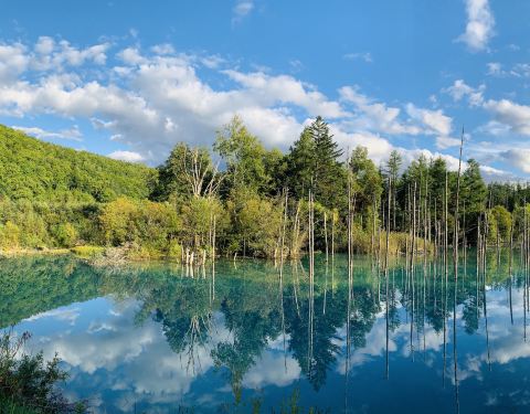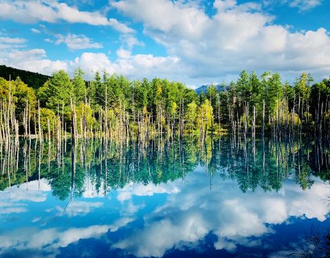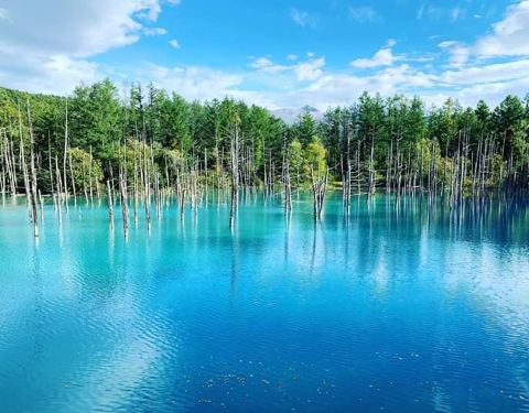 位于北海道美瑛町的白金青池,清澈见底的水蓝色湖水,衬托蓝天白云的好天气时,简直就如人间仙景,是游客必到的打卡胜地。湛蓝色的池水与耸立其后的白色枯松互相辉映,除了日间景色外,晚上亦有点灯活动,在晚上9点景区关闭前可前往参观。