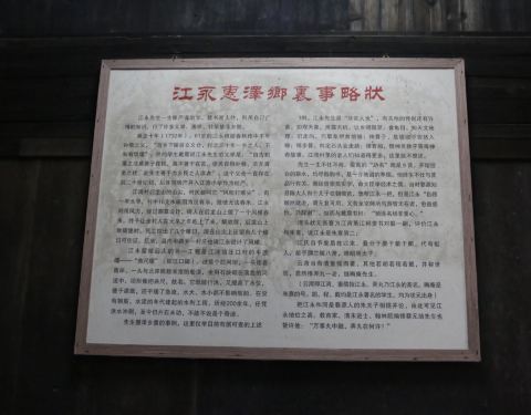 在江湾景区的小巷中发现了江永故居,让人多少觉得江湾这个古村落还是保留了些真正的历史遗存在江湾景区的小巷中发现了江永故居,让人多少觉得江湾这个古村落还是保留了些真正的历史遗存。这是个民居加私塾形式的老宅(虽然不是江永真正的故居),面积不大,布局紧凑,各房间厅堂功能各不相同。江永一生不仕...在江湾景区的小巷中发现了江永故居,让人多少觉得江湾这个古村落还是保留了些真正的历史遗存。这是个民居加私塾形式的老宅(虽然不是江永真正的故居),面积不大,布局紧凑,各房间厅堂功能各不相同。江永一生不仕不商,算是一介寒儒,但其潜心学问,所著甚丰,又开馆授学,将毕生所学尽传诸多弟子。 展开