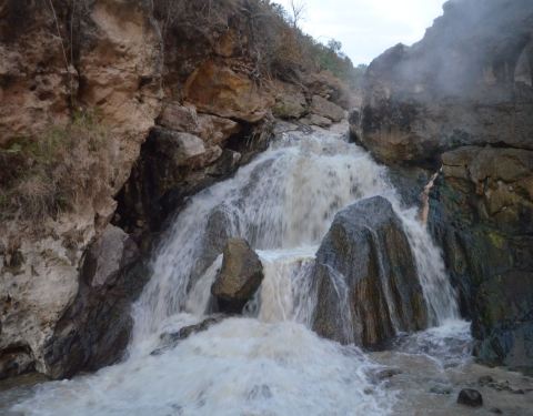 蛤蟆嘴在热海公园澡塘河瀑布的崖上。水温高达95.5℃,属动脉式喷泉。由于长期沸喷,钙华体现状似蛤蟆的嘴的喷水口,沸水向澡塘河斜射,射程1.5米,真像只只栩栩如生的蛤蟆在悠闲地吞云吐雾,并半有呼呼如鼓喉的声响,观之无不叫绝。