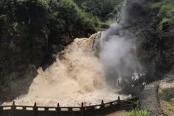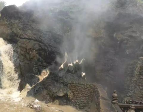 在下雨,水量大,上边好像有个瀑布,这里几只蛤蟆嘴巴在乎乎喷汽,声音也大,据说这里是徐霞客来过,他取的名字。地面都是烫的,天上下着雨,一些石板是干的。