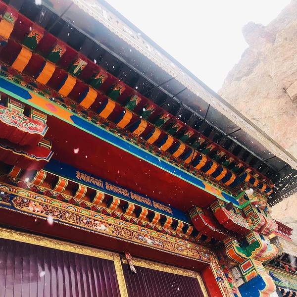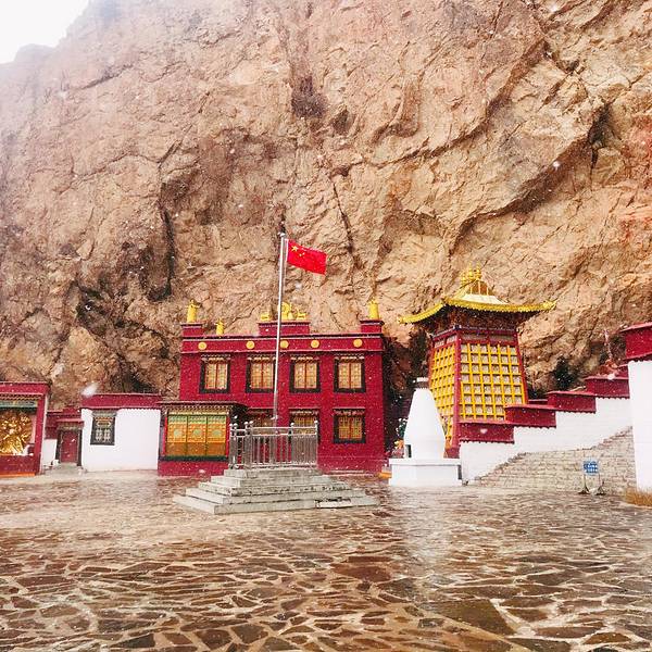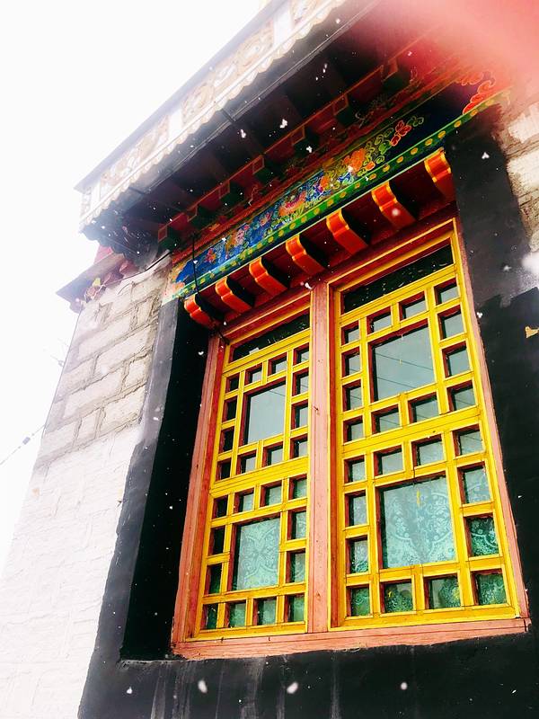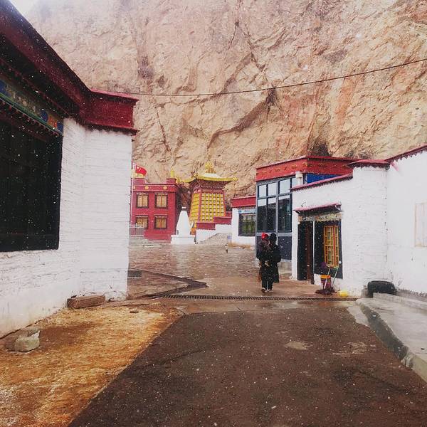 我们刚坐上车,我说这啥也没看到,好遗憾啊。后面那大哥一听,啥,没看到你们上车干什么,下一站就直接出去了。就开始劝我们下去,说这雪应该一会就停了,你们先下去等一会。想想也是,这走了6个多小时好不容易到了,什么都没看就到走了太遗憾,于是冒着雪又下了车。实在是没记住这大哥长什么样子,真的真的要谢谢他,不然我们就错过了这一路上最美的风景。 这个风简直能把人吹走了,雪越下越大,打到脸上疼疼的,根本睁不开眼睛。刚好前面有一个小房子,就想着进来先避一避。结果进来之后才知道,这里是扎西岛寺。这个大叔远远的抱着一个小女孩走过来,这个画面好美呀,也顾不上冷了,赶紧拿出手机拍了一张。