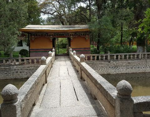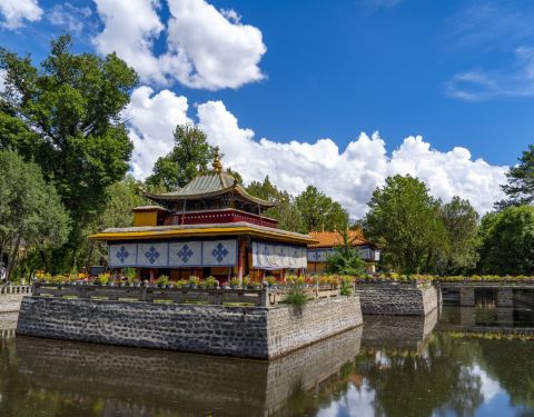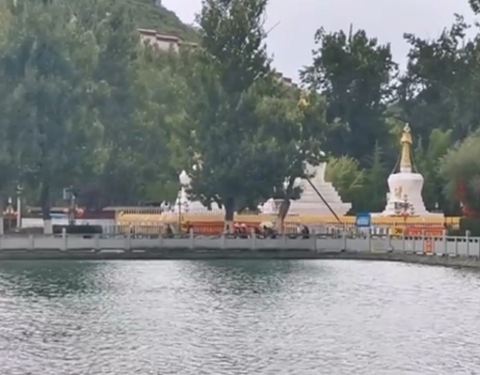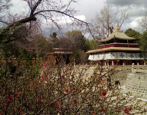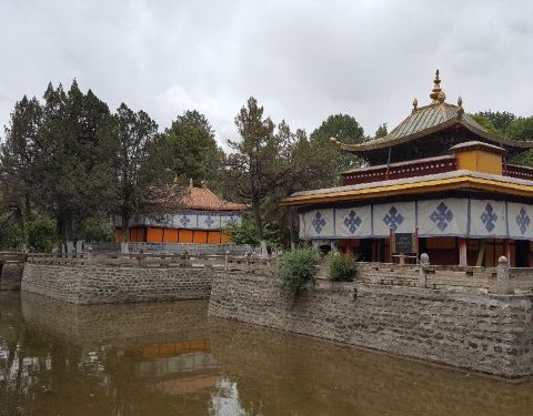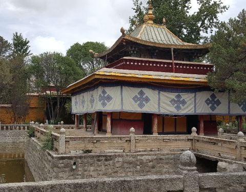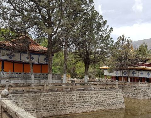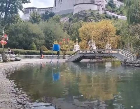 是罗布林卡内的核心建筑之一,建成于17世纪,由三座规模不大的藏式宫殿组成,由石桥相连,去的时候正好是淡季,工人们正在清理水池,夏季湖水充盈,有很多水禽在里面畅游。