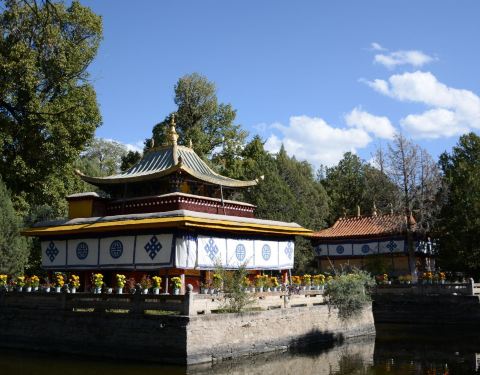 湖心宫是罗布林卡里一处令人印象深刻的建筑,首先是进入的门,据说当时特地造了可以让大象进入的门,湖心的三座宫由石桥相连,建筑风格汉藏结合,很美。