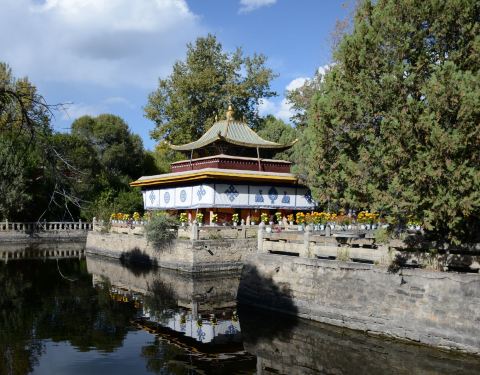 拉萨的湖心宫位于夏宫罗布林卡之内,是一个有江南园林色彩的建筑物,其四周全是水,在水中央建了一个汉族风格的建筑物,感觉上还是蛮好看的。